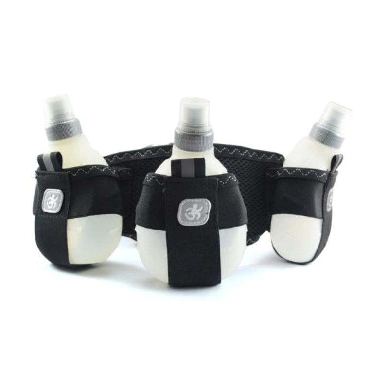 Las botellas de 250 cm3 son anatómicas, con niveles para poder tener en cada una de ellas la opción de utilizarlas para llevar geles (hasta 5 geles por botella). Graduadas cada 50 cm3, volumen éste que permite colocar un gel por cada uno de estos niveles y completar con agua o bebida isotónica. De esta manera, al completar con líquido, el gel pierde su densidad consiguiendo salir fácilmente de la botella, así como nivelar rápidamente para controlar el consumo. Las botellas están incluidas.